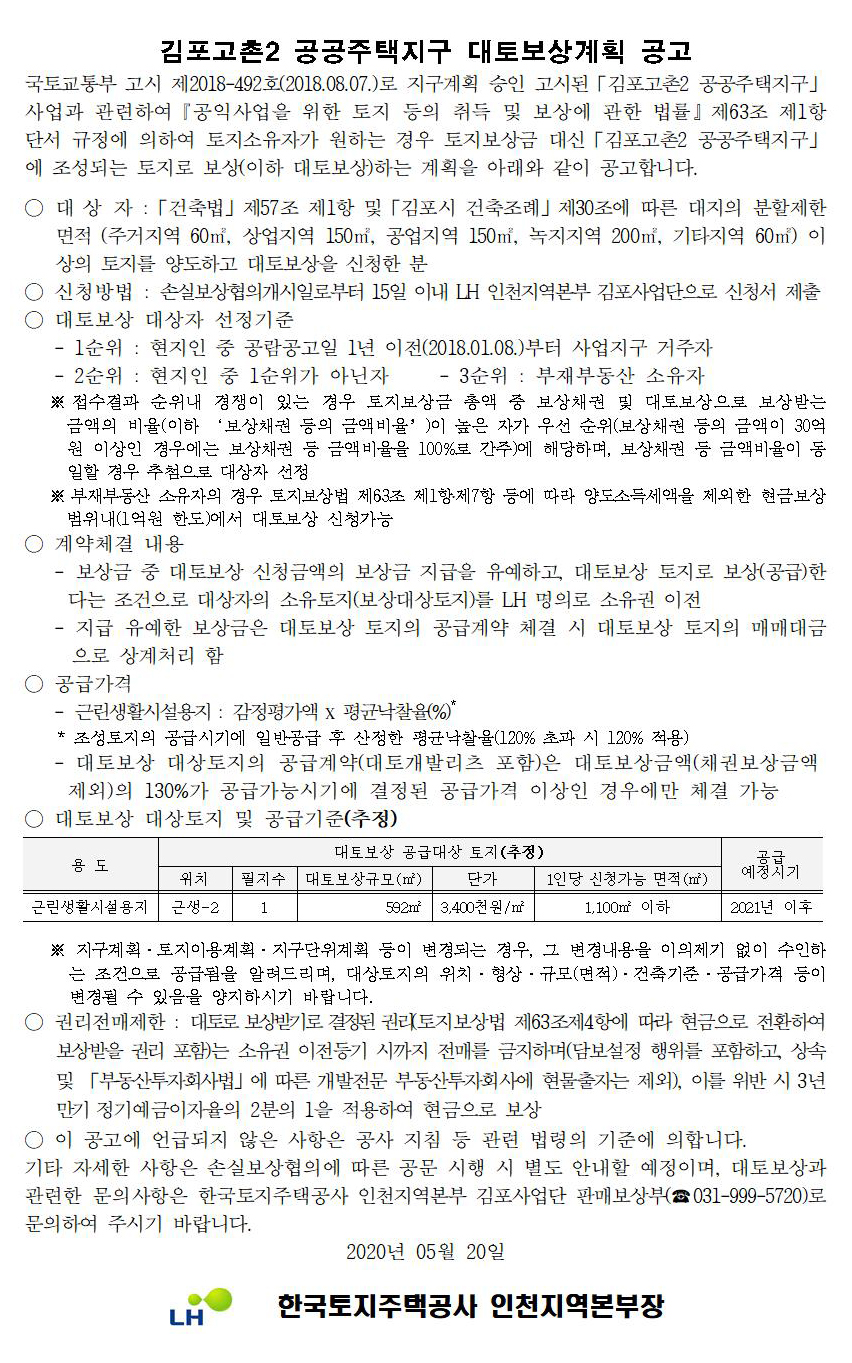 | 731 | 대토보상 | 김포고촌2 공공주택지구 대토보상계획 공고 | 2020-05-20 | 1361 |