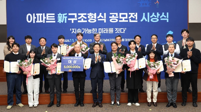 보도자료 배포2025. 11. 14.(금) / 즉시 보도 가능합니다.한국토지주택공사(LH), 아파트 신(新)구조형식 공모전 시상식 개최 - 구조혁신 아이디어 9건 선정, LH 사장상 및 총상금 1,400만 원 수여 - 학생, 전문가 등 총 79팀 참여, 지속가능한 아파트 구조형식 발굴 기여 □ 한국토지주택공사(LH)는 LH 경기남부지역본부에서 새로운 주거모델 발굴을 위한 '아파트 신(新)구조형식 공모전' 시상식을 개최했다고 14일 밝혔다. ㅇ 이번 공모전은 벽식·라멘 등 기존 획일화된 아파트 구조 형식에서 벗어나, 초고층화·재건축 등 미래 주거환경 변화에 대응할 수 있는 가변성과 경제성을 지닌 새로운 구조 대안을 마련하고자 기획됐다. ㅇ 또한 전문가뿐 아니라 학생 부문까지 공모 참여의 폭을 넓혀 새로운 시각과 창의적 발상을 적극적으로 끌어내는 데 주력했다. ㅇ 공모는 지난 7월부터 6주간 진행됐으며, 총 79팀(전문가 부문 12팀, 학생 67팀)이 참여했다. 수상작은 4개 평가항목(▲창의성 ▲구조적타당성 ▲경제성 ▲시공성)을 기준으로, 구조 전문가로 구성된 심사위원단의 2단계 심사를 통해 최종 선정됐다. ㅇ 심사 결과 ▲대상 1팀(500만 원) ▲우수상 2팀(각 300만 원) ▲장려상 6팀(각 50만 원) 등 총 9개 팀이 선정됐다. □ 대상은 프리캐스트 콘크리트(PC)에 기반한 모듈형 구조시스템을 제안한 ‘동서피씨씨’ 팀의「짓고 싶은 집, 살고 싶은 집, 공동주택 PC공법」이 선정됐다. ㅇ 전문가 부문 우수상은 포스트텐션 슬래브를 적용하여 장스팬을 구현한 ‘해밀이앤씨+후레씨네코리아’ 팀의 「세대 내부벽체 ZERO 가변형 아파트 평면」이 선정됐으며, 학생 부문 우수상은 벽식 구조의 안정성과 라멘 구조의 유연성을 결합한 하이브리드 시스템을 보여준 경북대학교(최재현) 팀의 「CLoVa 구조(Core+Load bearing wall+Variation」이 선정됐다. □ LH는 공모전에서 발굴된 우수 아이디어를 구체화, 고도화하여 지속가능한 주거모델 개발을 본격 추진할 계획이다. □ 이상욱 LH 사장 직무대행은 “이번 공모는 주거환경 변화에 대한 대안이자 새로운 주거모델 발굴의 시작점으로, 신(新) 구조형식에 대한 다양한 아이디어를 수렴할 수 있었다”라며 “계속해서 지속가능한 미래 주거모델을 구현할 수 있도록 최선을 다할 것”이라고 말했다. 담당부서설계검증처책임자팀 장 박세준(055-922-4164) 담당자차 장오치연(055-922-4187)